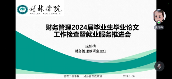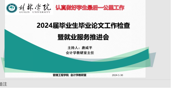 为确保2024届毕业生毕业论文工作的顺利进行和就业服务的有效推进,1月29—30日,管理工程学院工商管理等9个专业通过腾讯会议分别开展了毕业论文工作检查暨就业服务推进会。学院领导班子、各教研室主任、全体论文指导教师和毕业班辅导员一起为毕业生顺利毕业、就业出谋划策。