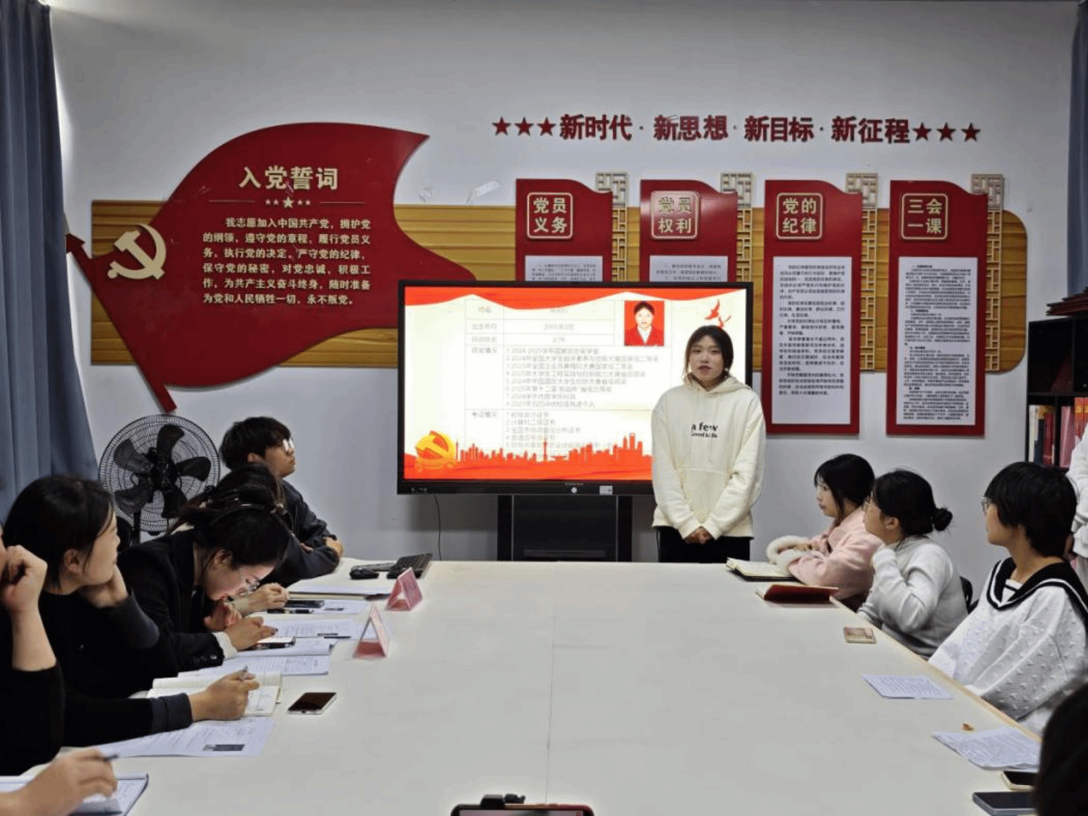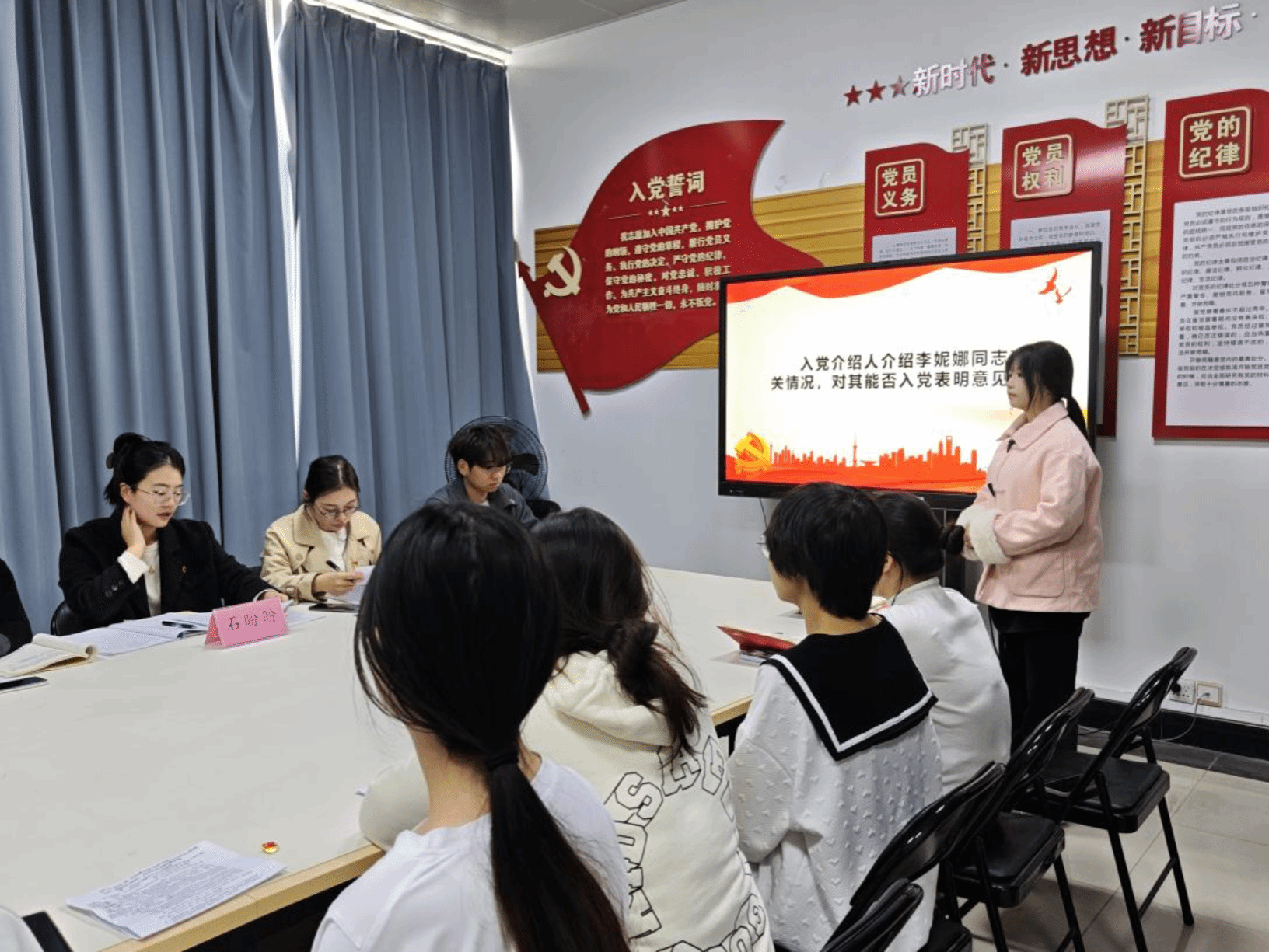 大会严格按《中国共产党发展党员工作细则》推进,重点讨论李妮娜等9名同志的入党问题。9名发展对象依次登台,汇报培养考察期内思想、学习、工作情况,结合财务管理、物流工程等专业经历,阐述对党的认识与入党动机,表达入党决心。