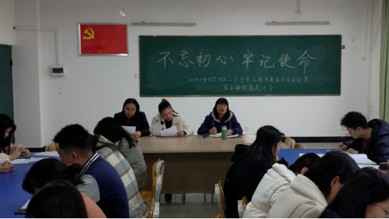 12月18日,经济与管理学院第二学生党支部在3307教室召开“不忘初心、牢记使命”专题组织生活会暨民主评议党员大会。会议以习近平新时代中国特色社会主义思想为指导,紧扣“不忘初心、牢记使命”主题教育,勇于开展批评与自我批评,激励广大党员强化思想观念、提高党性修养,自觉践行“四个合格”。党支部全体党员参加大会,会议由支部书记谢鹃霞主持。