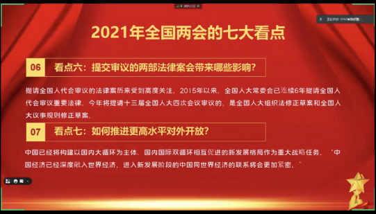 全体成员奏唱《国际歌》后,主持人为大家介绍本次“两会”对于我国未来工作建设的重要意义。支部成员共同学习2021年全国两会的“七大看点”、“九大关键词”并观看人大开幕式视频。会上,支部成员黄韵名同志结合广西的时事政策分享自己的心得体会,她表示,作为学生党员要认真学习贯彻"两会"精神,不忘初心,为同学们服务,为人民服务,同时也要脱离舒适区,走进新时代,实现新作为。支部书记郝环一同志总结并对支部成员提出倡议:一是学习两会精神要从最基础的知识学起,根基扎实才能有进一步的提高,不能好高骛远;二是要紧密联系自身实际学,从两会精神中汲取知识,努力提高自身理论知识水平,为未来发展做出准备。