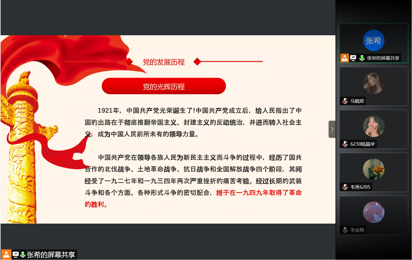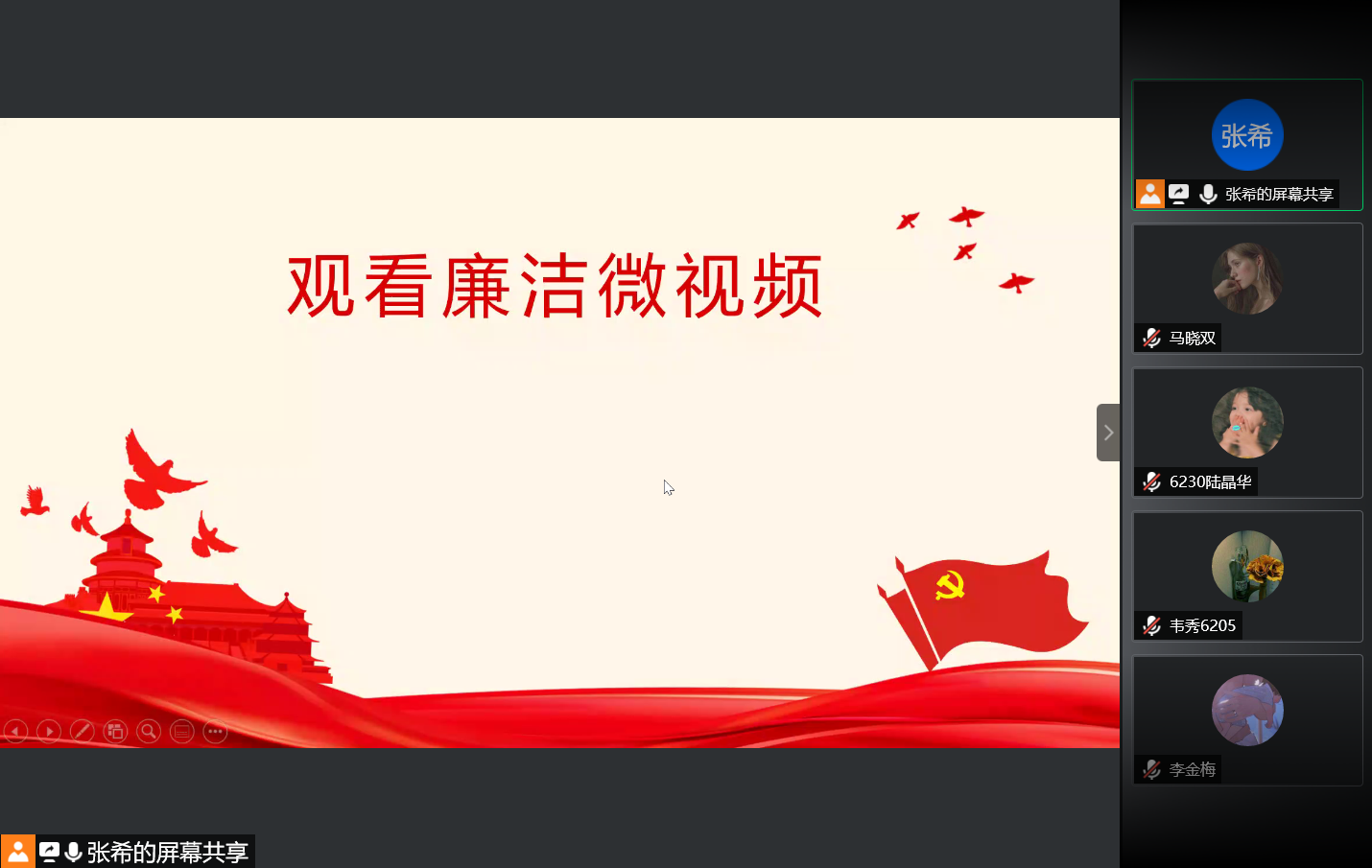 活动以奏唱《国际歌》开始,激昂的旋律激起了全体成员心中对党和人民的热爱,始终铭记牢记初心,不忘使命的重任。接下来,主持人讲述了党员学习党史的意义,在研究党史中增强理论自信,总结失误和教训。其次,主持人提到“学党史讲廉洁永葆党员本色”和“廉洁永远在路上”两方面内容,作为党员同志,要加强理论学习,充分了解党的历史,守住做人处事的底线,时刻保持着党员的纯洁性。最后,通过观看廉洁微视频,全体党员深入了解了“廉文化”的重要意义和内涵,进一步学习了廉洁奉公、严以律己的道德精神,促使党员树立正确的利益观,增强党员的廉洁自律意识、忧患意识、责任意识和担当意识。