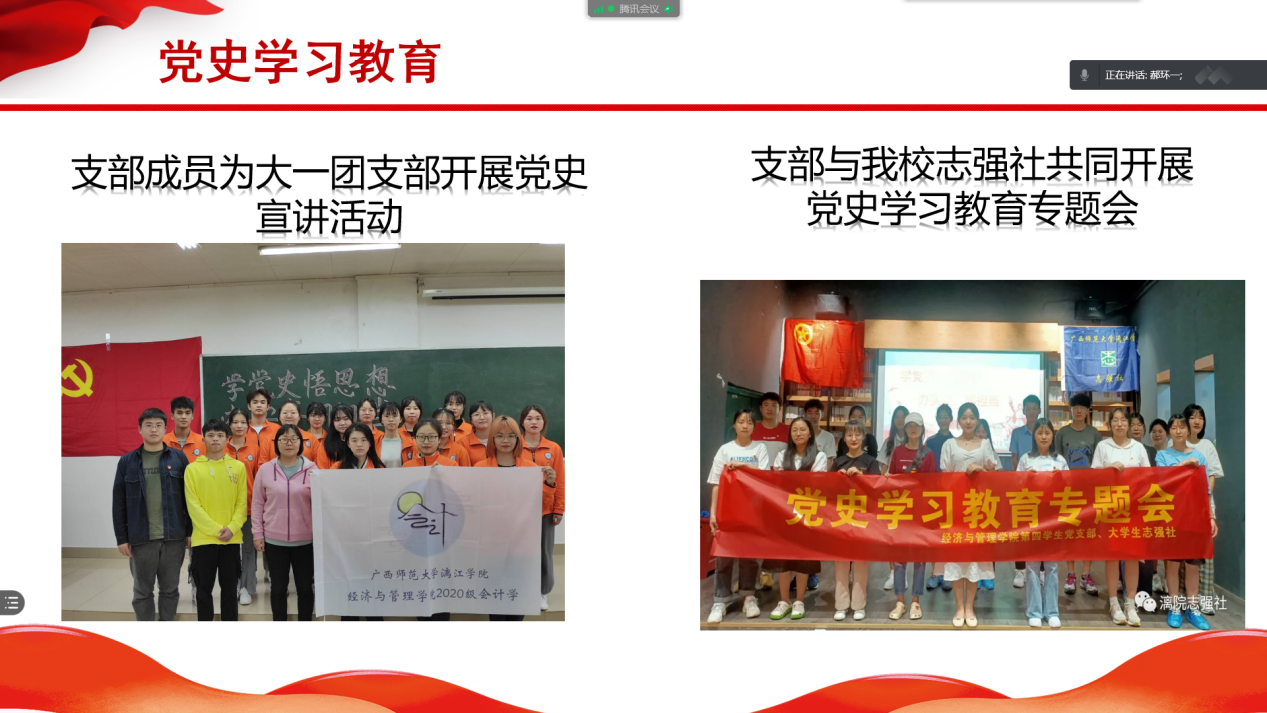 为认真贯彻落实“学史明理、学史增信、学史崇德、学史力行”的目标要求,紧紧围绕学懂弄通,做实党的创新理论。7月7日19:00,经济与管理学院第四学生党支部通过“云会议”的形式召开党史学习教育专题组织生活会。设计学院党总支书记张丽及经济与管理学院党总支组织委员高艳玲列席指导本次会议,支部全体成员参加此次会议,会议由支部书记郝环一同志主持。