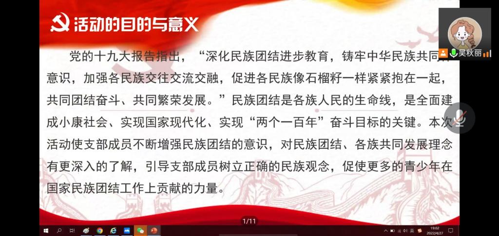 为加强我支部师生对民族团结进步教育,深化各民族交往交流交融。4月27日,经济与管理学院第四学生党支部开展了以“弘扬民族团结精神 展示强国有我风采”的线上主题党日活动,第四学生党支部书记郝环一、副书记贺春先及支部所有成员参加了此次活动。