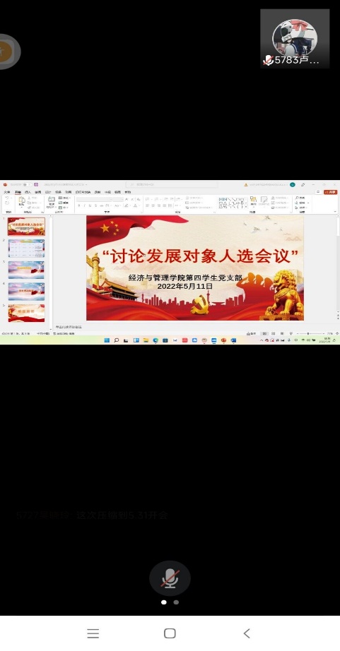 根据我院讨论发展对象人选的工作计划和安排,经济与管理学院第四学生党支部于2022年5月11日通过线上会议的方式开展讨论发展对象人选会议,党支部书记郝环一同志,副书记贺春先同志和全体支部委员参加此次会议。