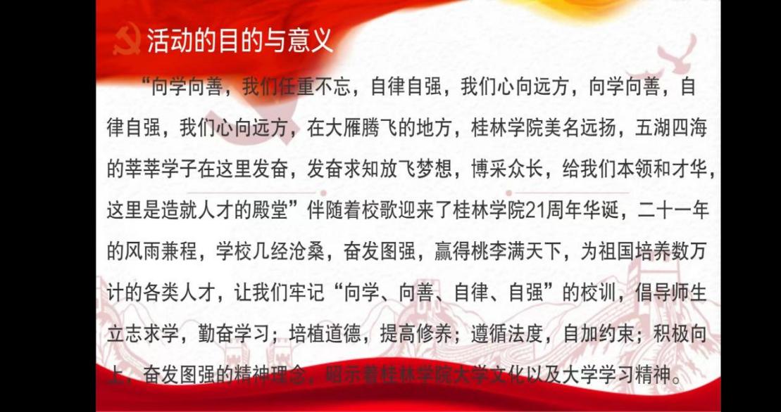 活动伊始,主持人讲解了本次活动的目的与意义,通过回顾学院历史,重温学院简介,使我支部师生充分了解学院光荣历史及办校历程,增强支部成员爱校荣校的意识。接着党支部成员观看校歌《造就人才的殿堂》视频,通过观看视频,让我支部成员更加生动形象的了解校园环境,感受校园生活学习的温暖氛围。随后支部成员吴晓玲发表感言,她说在桂林学院生活学习三年多的时间,感恩在这里遇到了良师益友。在学校21岁生日之际,祝福学校越来越好。最后支部副书记贺春先表示,自转设以来,学校各项事业再上新台阶,创办绿色校园,这更加符合学校的长远发展。