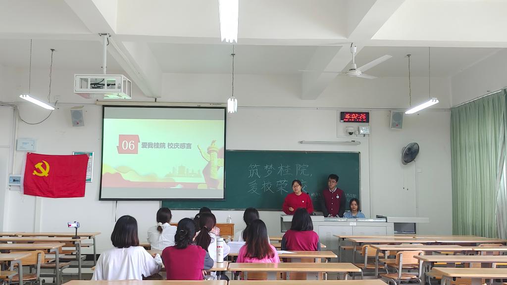 为激发我支部师生爱校热情,充分彰显本校师生爱国荣校的主人翁意识,激励引导我院大学生以感恩奋进、坚定信心的热情信念谱写学校事业新征程。5月25日下午,经济与管理学院第四学生党支部以线上+线下相结合的方式在3412教室开展了以“筑梦桂院 爱国荣校”为主题的党日活动,第四学生党支部书记郝环一、副书记贺春先及支部成员参加了此次活动。