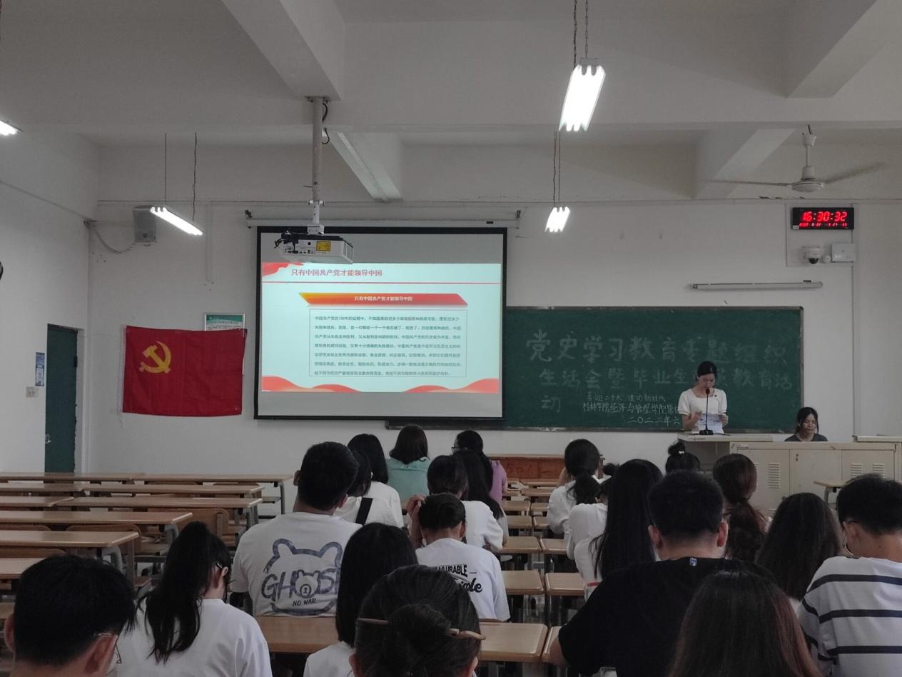 6月22日下午,经济与管理学院第四学生党支部在3413教室开展“党史学习教育专题组织生活会暨毕业生党员教育活动--喜迎二十大,建功新时代”活动,本次党史学习教育专题组织生活会暨毕业生党员教育活动是为教育引导党员同志坚持以习近平新时代中国特色社会主义思想为指导,遵守党章、党规,深入开展的党史学习教育,发挥党员先进性,喜迎二十大,建功新时代;同时也是将毕业生党员教育工作抓严做实,进一步把好学生党员的“出口关”。党支部书记郝环一、党支部副书记贺春先以及第四学生党支部成员列席参会。