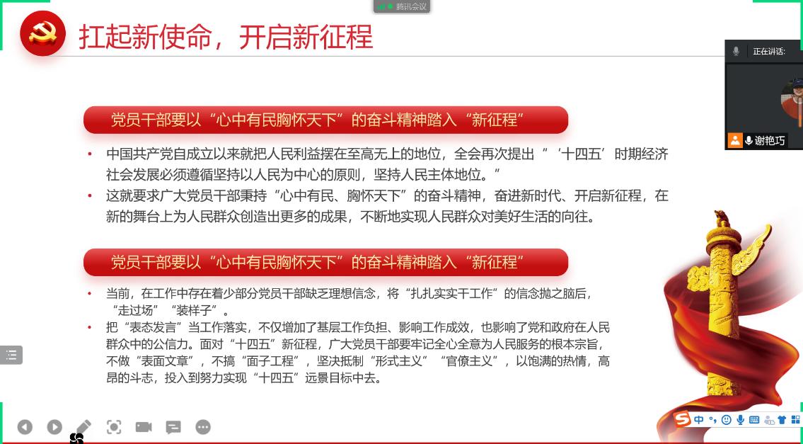 图二:主持人讲解党员干部要如何扛起新使命,开启新征程