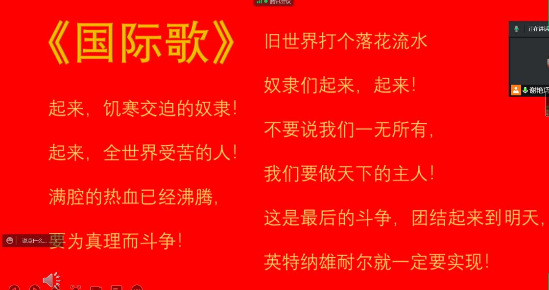 为庆祝中国共产党成立101周年,传承红色基因,弘扬革命传统。经济与管理学院第四学生党支部于7月1日19时在腾讯会议开展以“庆七一•忆党史”的主题党日活动,第四学生党支部书记郝环一,副书记贺春先及全体党支部成员参加了此次会议。