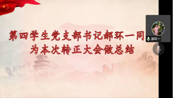 11月28日晚上,经济与管理学院第四学生党支部在腾讯会议召开线上预备党员转正大会,党支部书记郝环一同志、副书记贺春先同志以及全体党员参加会议。