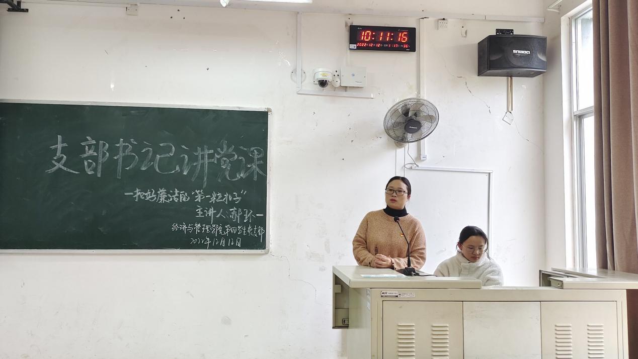 为进一步厚植校园廉洁教育,营造倡廉、数廉、学廉、守廉的良好氛围。12月12日经济与管理学院第四学生党支部召开了以“扣好廉洁自律的第一颗扣子”为主题的党课,支部书记郝环一同志主持此次会议,支部全体成员参加。