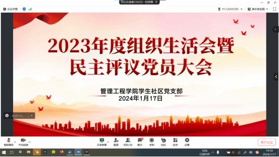 2024年1月17日晚上,管理工程学院学生社区党支部通过腾讯会议线上召开2023年度组织生活会暨民主评议党员大会。管理工程学院学生社区党支部书记沈娟、副书记傅秋月以及支部全体成员参加此次评议大会。