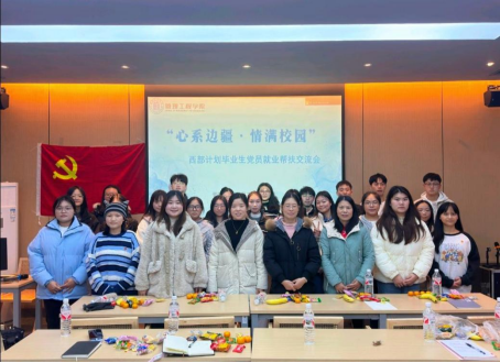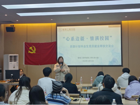 为深入贯彻党的教育方针,进一步点燃青年学子扎根基层、服务人民的热情,增强他们的使命感和责任感,12月12日下午,管理工程学院第二学生党支部在杉湖家苑“一站式”学生社区辅导员工作室举行“心系边疆·情满校园”西部计划毕业生党员就业帮扶交流会。会议邀请了本支部2024届毕业生党员韦柳玉同学进行交流分享,支部全体成员参与。