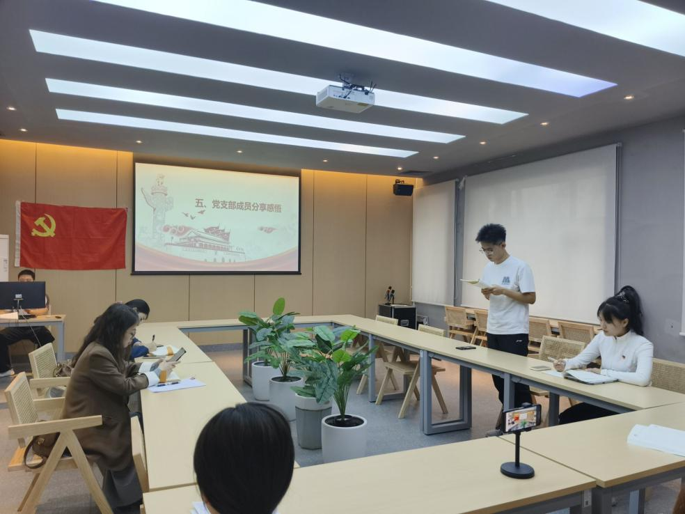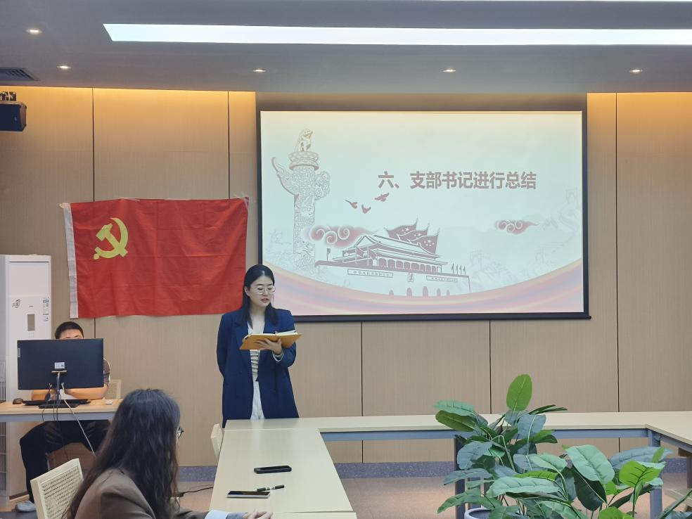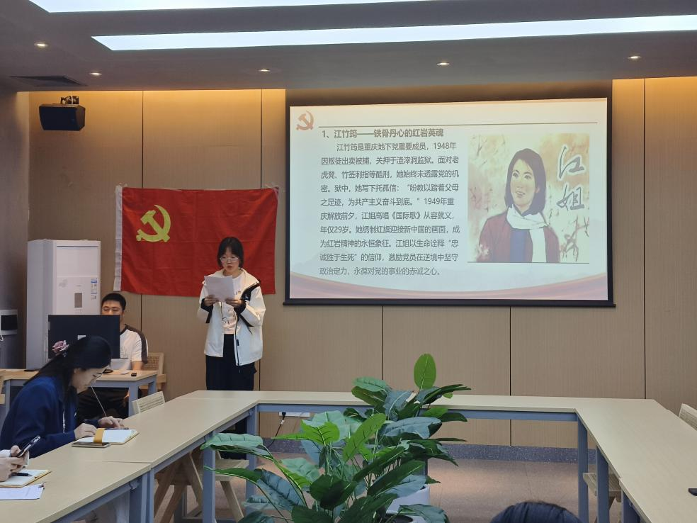 活动开始,主持人介绍主题党课活动背景、目的及意义。紧接着,全体支部成员奏唱《国际歌》。随后,主持人分享江竹筠不畏强权、董存瑞舍身炸碉堡以及王进喜拿下大油田的故事。紧接着支部成员观看《建党百年版错位时空》。党支部成员许卓同志发表感悟,身处和平年代的我们应该保持乐观向上的心态,树立责任担当意识,提高自己的综合素质,刻苦钻研科学文化知识,勇担时代大任,为党分忧、为国奉献、为民服务,用实际行动履行爱国义务。最后,支部书记对大会进行总结,支部成员应以思想教育为依托点,活动为支撑,明白自己肩上担的使命,新时代,党员同志们要有强烈的社会责任感和使命感,以积极向上的精神面貌投身祖国建设,努力学习,拼搏创新,成为有为的党员,为实现中华民族伟大复兴的中国梦贡献力量。