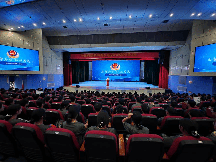 为提高新生安全防范意识,筑牢校园反诈防线,9月10日,工商管理学院组织2025级全体新生参加防范电信诈骗专题讲座,此次讲座由桂林市公安局雁山分局警官主讲。学院新生辅导员及班级助理共同参加了此次活动。