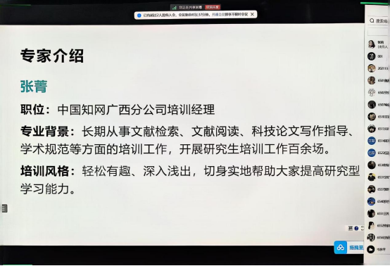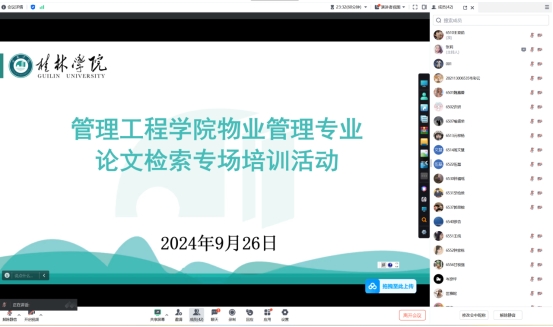 9月26日晚,由图文信息中心主办、管理工程学院物业管理专业组织的《毕业论文写作文献资源检索与利用》培训会在线上顺利举行。此次培训会特别邀请了中国知网广西分公司的培训经理张菁担任主讲,面向物业管理专业全体师生,旨在提升物业管理专业毕业生在论文撰写过程中的信息检索与利用能力。