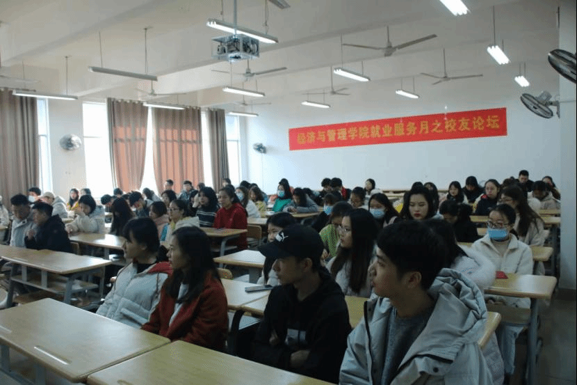 为帮助2021届应届毕业生认清就业形势,了解经济管理类就业市场要求,做好就业准备,我院于12月6日下午15点30分在1402教室,顺利举办了经济与管理学院就业服务月之校友论坛,论坛邀请了苏厚鹏(现任职于广西北部湾银行桂林高新支行金融部经理)、骆慧蓉(现就职于中国银河证券桂林中山路营业部客户经理)和沈娟(现就读于广西师范大学教育与经济专业研究生),我院毕业班辅导员贺春先和2017级90名同学共同参加了论坛。