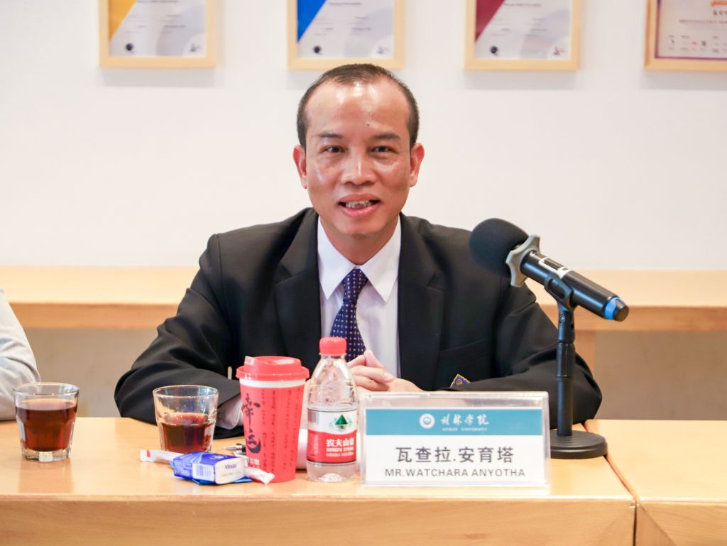 吴郭泉校长对泰国孔敬府教育厅瓦查拉·安育塔厅长一行的到访表示热烈欢迎,感谢泰国孔敬府教育厅及有关学校为我校48名学生赴泰实习所作的周到安排和关照,并介绍了我校在开展中泰文化教育合作交流方面的成果。他指出,桂林学院一直秉承“至善”办学理念,致力于建设成为高水平应用型大学,国际化办学和教育合作交流是学校内涵提升、多样化发展的重要举措。瓦查拉·安育塔厅长一行的本次到访,给桂林学院提供了新机遇,为师生搭建了更广阔的合作交流平台,希望双方以此为契机,在中文国际教育师资培养方面进一步建立友好关系,深入探讨更多元、更深层次的务实合作与交流路径,共同书写中泰友谊的新篇章。
