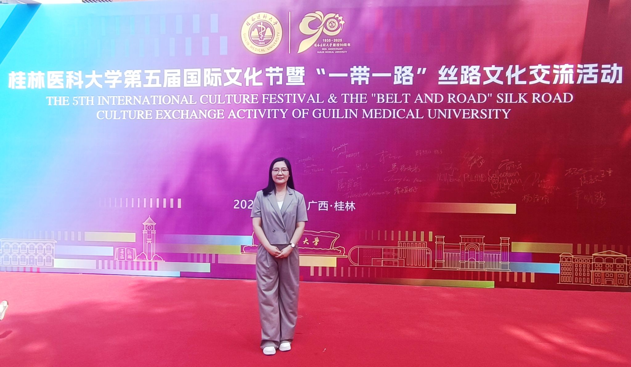 2025 年 10 月 17 日上午,时值桂林医科大学九十周年华诞,其第五届国际文化节暨 “一带一路” 丝路文化交流活动在临桂校区国际教育交流中心盛大举行。国际合作与交流处副处长受邀参与此次盛会,共筑国际教育交流桥梁。