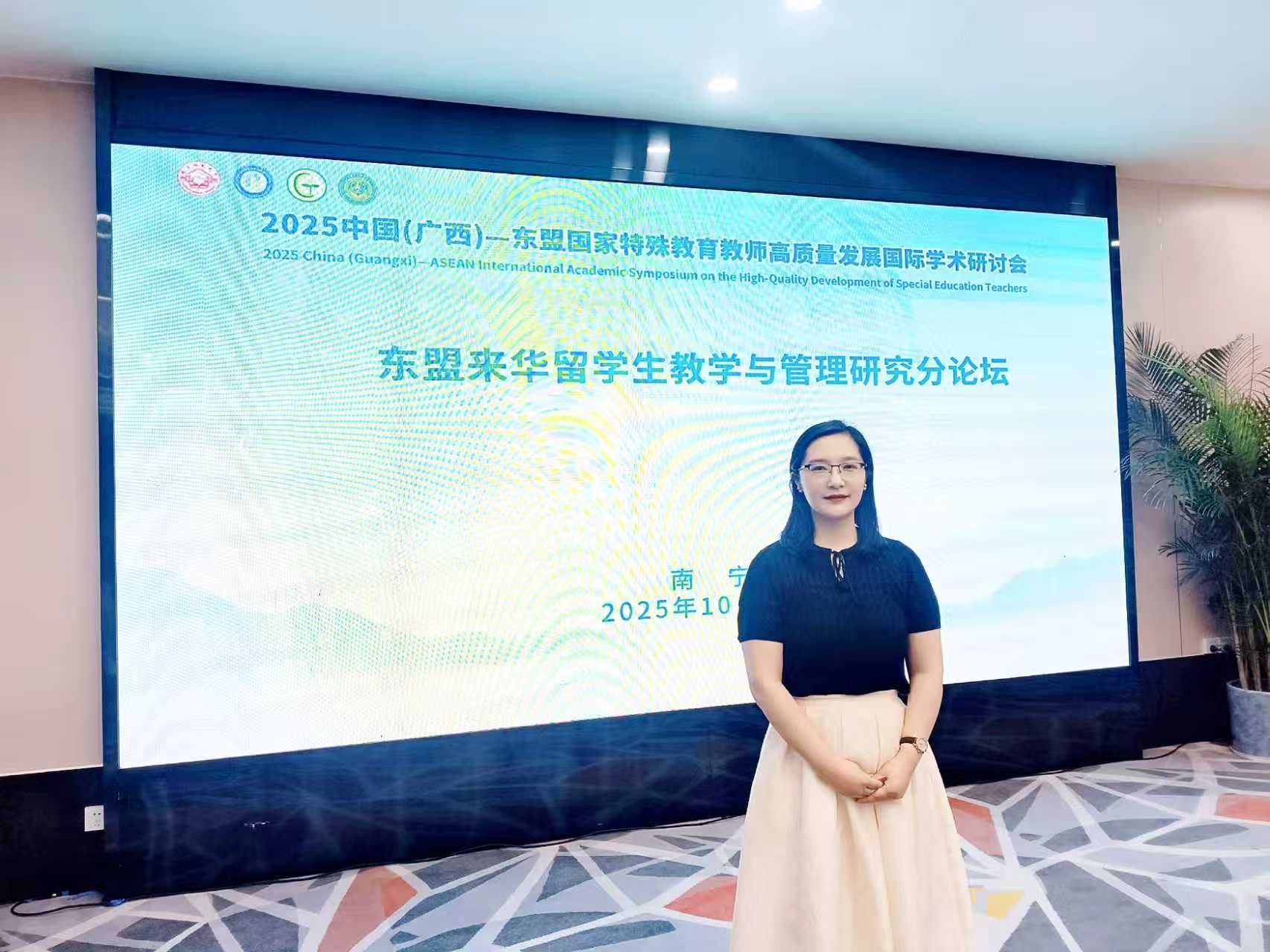 On October 11, the Sub-forum on Teaching and Management of ASEAN International Students in China, part of the 2025 China (Guangxi) - ASEAN International Academic Seminar on the High-Quality Development of Special Education Teachers, was held in Nanning. Hosted by the Foreign Student Education and Management Professional Committee of Guangxi Higher Education Association (referred to as Guangxi Foreign Student Management Association), the forum gathered more than 40 representatives from member units of the association. Wang Jing, Deputy Director of the Office of International Affairs of our university, attended the event.