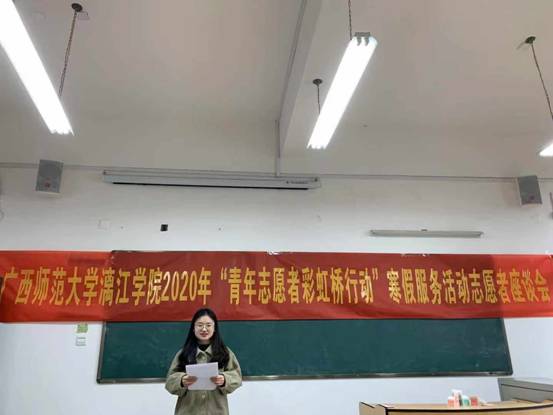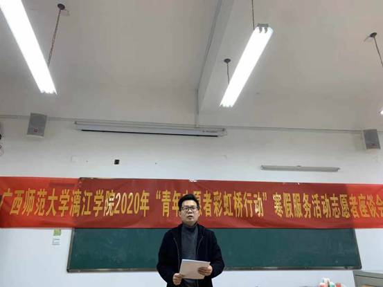 为了深入贯彻党的十九大精神,鼓励和引导青年大学生服务社会,关心人民,激发青年志愿者的服务热情,我校积极配合自治区司法厅、共青团广西区委开展2020年广西“青年志愿者彩虹桥行动”寒假服务活动。为了落实本次青年志愿者彩虹桥行动的服务目标,服务要求及总结注意事项,1月3日上午在3410教室举行“青年志愿者彩虹桥行动”启动仪式。参加本次活动的嘉宾有校团委书记王瑞老师,校团委负责老师,语言文学学院辅导员黄幸津老师,商贸与法律学院团总支书记许承婷老师。