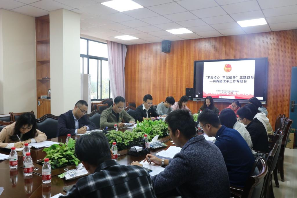 根据学校“不忘初心、牢记使命”主题教育工作方案,校团委严格按照工作要求,聚焦主题主线,结合共青团具体工作实际,扎实推进团学改革工作的深入,于11月13日下午在8315会议室召开“不忘初心 牢记使命”主题教育----共青团改革专题会。校党委书记、纪委书记、副校长邓志平出席此次会议、学生事务部部长蒋远宏、学生事务部副部长/校团委书记王瑞及校团委全体老师、各二级学院团总支书记、副书记参加了此次会议。会议由校团委书记王瑞主持。