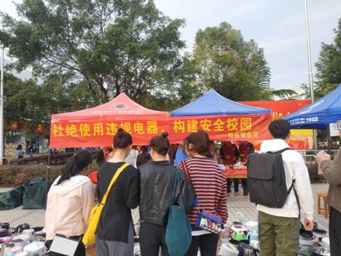 前期,校自管会通过线上宣传,线下走访等多种形式对活动进行了宣传,取得了良好的宣传效果,推动了活动的开展。此次活动主要通过展板宣传、实物展示、案例播报、现场讲解等形式向同学们介绍违规电器的种类和使用违规电器可能带来的严重后果,其中所展违规电器实物约100余件,包括电饭煲、热得快、烧水壶等,均为近年来在学生宿舍日常例行检查以及全校性大规模安全检查中收缴暂存的物品。展板及播报的内容则涉及到一些具体的因使用违规电器而酿成火灾的案例、避免火灾的方法、灭火的方法等,给同学们以警示,也通过实际案例让同学们更加清楚地了解使用违规电器的危害。