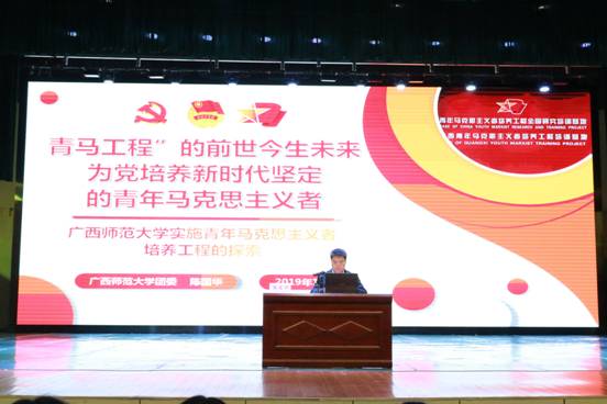 此次主题是“青马工程”的前世今生未来为党培养新时代坚定的青年马克思主义者——广西师范大学实施青年马克思主义者培养工程的探索。”其中,前世指“不忘初心,深刻认识实施青年马克思主义者培养工程的重大意义”,今生指“牢记使命,广西师大实施青年马克思主义者培养工程的实践探索,未来指“紧跟党走,全力以赴为党培养更多堪当时代大任的青年马克思主义者”。