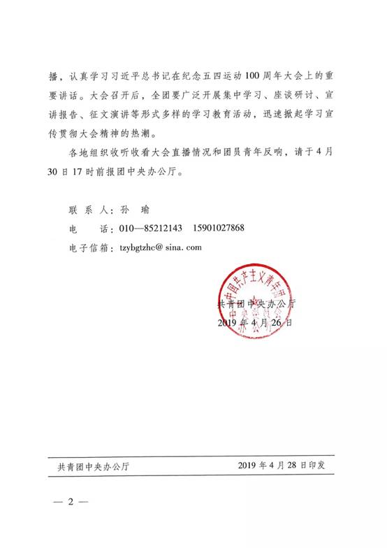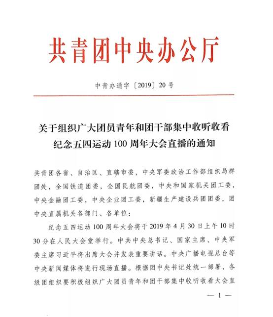 共青团中央办公厅印发《关于组织广大团员青年和团干部集中收听收看纪念五四运动100周年大会直播的通知》。通知要求,各级团组织要积极组织广大团员青年和团干部集中收听收看大会直播,认真学习习近平总书记在纪念五四运动100周年大会上的重要讲话。大会召开后,全团要广泛开展集中学习、座谈研讨、宣讲报告、征文演讲等形式多样的学习教育活动,迅速掀起学习宣传贯彻大会精神的热潮。