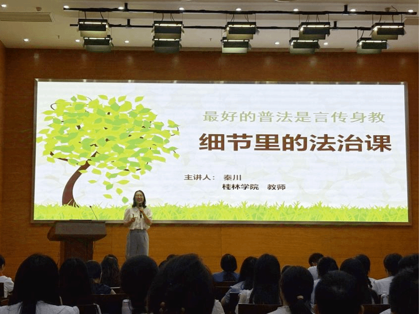 开班式强调,全体学员要深刻领会做好新时代宣讲工作的重要意义,充分发挥“青年讲师团”“红领巾巡讲团”理论武装“轻骑兵”作用,积极探索青少年喜闻乐见的宣讲方式和语言体系,将“大道理”转化为“小故事”,用“青言青语”“童言童语”讲好党的创新理论,用身边的鲜活事例、生动的典型故事来阐释深刻道理,积极探索分众化宣讲模式,让宣讲更接地气、更有温度、更富亲和力。会上,桂林市青年讲师团成员代表、红领巾巡讲团成员代表围绕宣讲技巧及备课主题等方面结合自身宣讲经验进行授课分享。在讲师试讲环节,我校青年教师、自治区级青年讲师团成员秦川老师以“最好的普法是言传身教-细节里的法治课”为题作试讲发言。