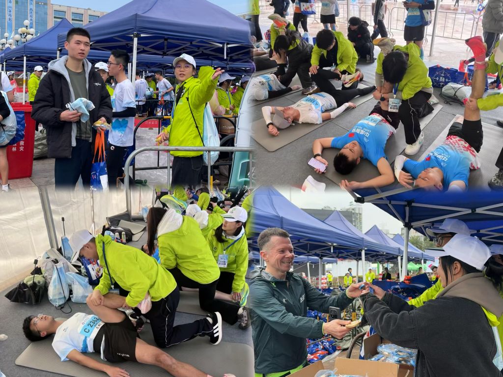 在比赛中,我校体育与健康学院3名教师凭借严谨的态度和专业知识,全程参与赛事执裁,确保了比赛的公平公正。在漓江畔的补给站,志愿者们细致地为选手递水、补充能量胶;在关键路口,他们高举指引牌,用洪亮的声音为选手指引方向……更有来自体育与健康学院的90名学生志愿者分组协作,一组志愿者负责引导运动员至拉伸区域并讲解注意事项;另一组则凭借专业的手法为近3000名运动员提供拉伸服务。