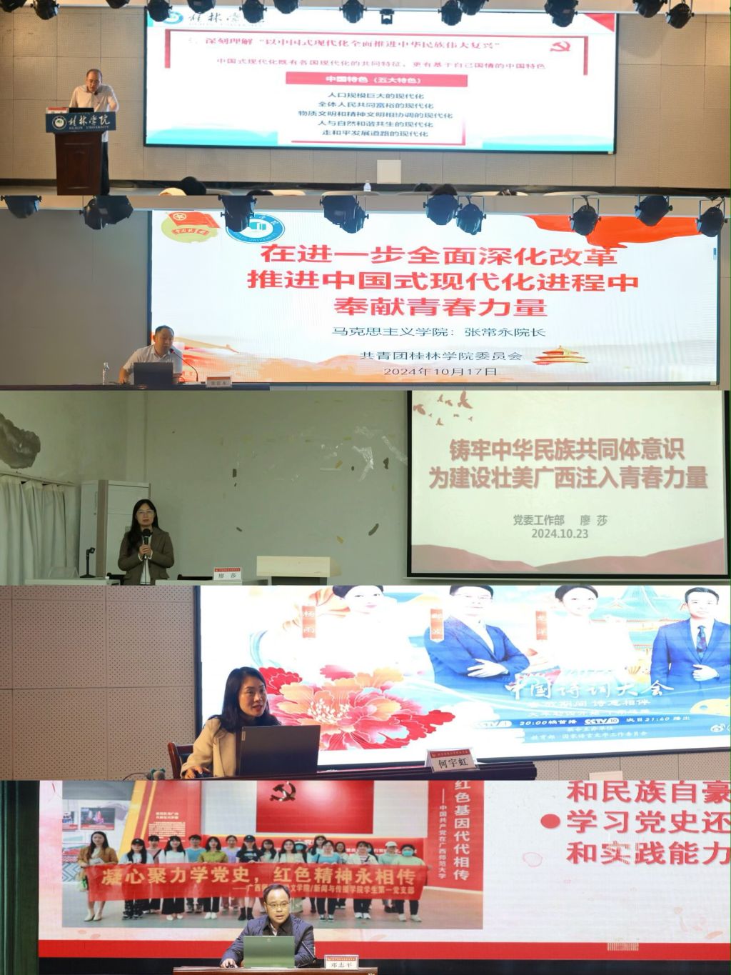 校党委委员、教育学院党总支书记以《青春为中国式现代化挺膺担当》为主题,结合党的二十大精神,从八个“深刻理解”生动阐述了青年在新时代的担当与作为。学校马克思主义学院院长以《在进一步全面深化改革推进中国式现代化进程中奉献青春力量》为主题,带领同学们学习贯彻党的二十届三中全会精神,鼓励青年学子要勇于担当、敢于创新,积极投身改革实践,用智慧和汗水书写属于自己的时代篇章。学校党委工作部负责人围绕《铸牢中华民族共同体意识为建设壮美广西注入青春力量》这一主题,详细讲解了党的民族理论和民族政策,加强青年学生对中华民族共同体意识的了解,激发其为壮美广西建设贡献青春力量的热情。广西师范大学文学院/新闻与传播学院何宇虹博士以《做中华民族现代文明传播的使者》为主要内容,结合自身经历,生动讲解了中华民族现代文明的特征和建设中华民族现代文明的重要意义。广西师范大学文学院/新闻与传播学院党委书记邓志平以《磨砺“精神之刃”,点亮“启航之灯”——与桂林学院青马班学员谈理想信念》为主题,进一步点燃并巩固同学们心中的信念之火,增强其自身的免疫力,提高辨别是非的能力,确保在人生的道路上始终沿着正确的方向前进。