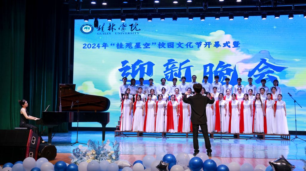 晚会期间,颁发了第十七届“桂苑星空”校园文化节“一院一品”活动奖项,并举行了2024年“桂苑星空”校园文化节开幕式授旗仪式,一年一度的“桂苑星空”校园文化节以多元的形式推进校园文化的建设与发展,这不仅是一种庄重的仪式,更象征着“至善”文化的精神传承。