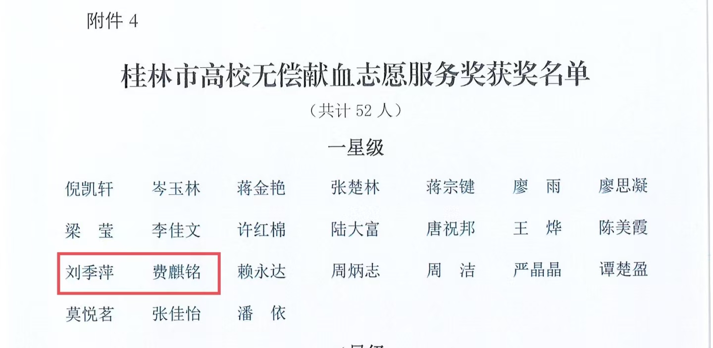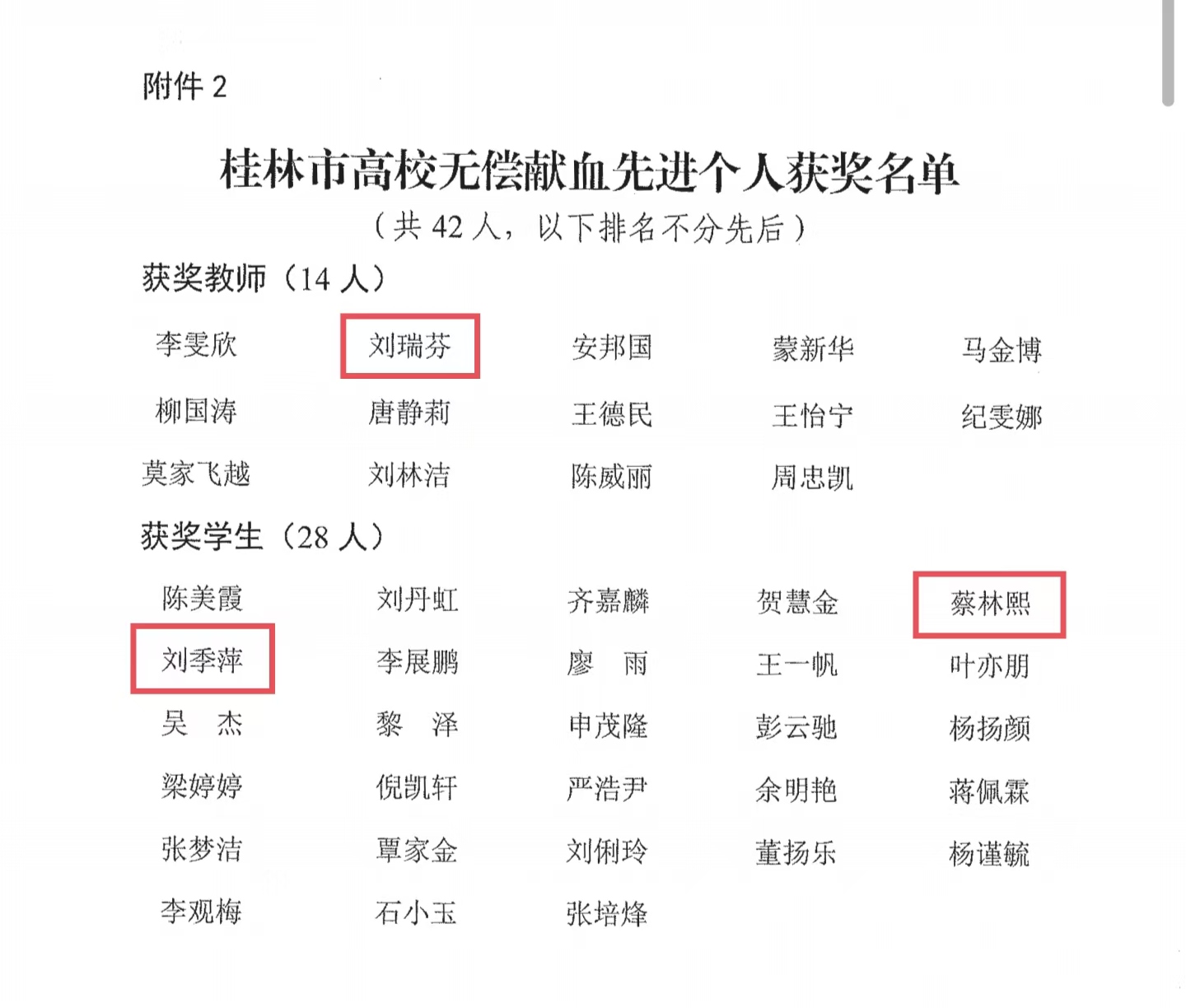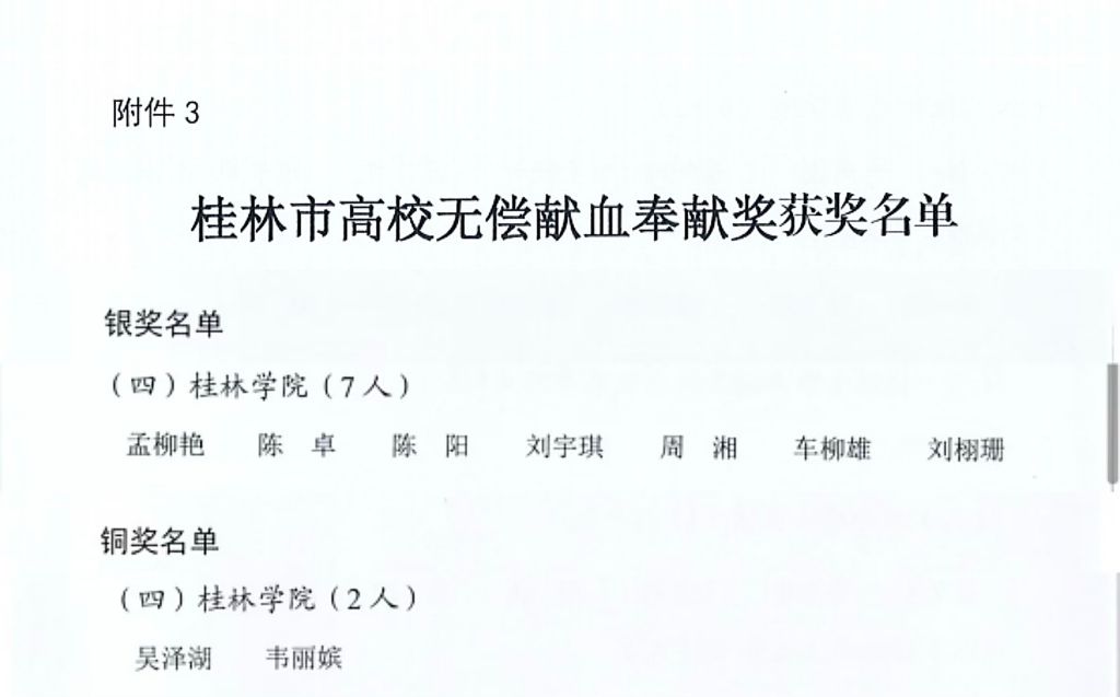 近日,桂林市献血委员会办公室印发了《关于表彰奖励2023年度桂林市高校无偿献血先进单位和个人的通知》和《关于公布2023年度高校无偿献血公益奖学金评选结果的通知》,我校共有32名师生荣获无偿献血表彰,18名同学获无偿献血公益奖学金。