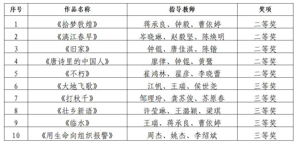 近日,自治区教育厅公布了广西第七届大学生艺术展演活动评审结果。我校共有38件作品获奖,分别为“校长风采奖”1项,一等奖11项,二等奖14项,三等奖12项。其中,我校选送的高校校长书画摄影作品《大地乐章》、学生艺术作品《人间烟火》以及高校美育改革创新优秀案例《“演艺型+沉浸式”艺术类课程群美育实践路径探索》三件作品脱颖而出,被推荐至全国展出,是我校在该项比赛中的历史新突破!同时,学生艺术实践工作坊作品《木构学生艺术实践工作坊——模型艺术赋能美丽乡村》荣获一等奖,为我校在该比赛类别中的历史最佳成绩。据统计,在本次大艺展中,我校荣获奖项数量及被推荐至全国参评的作品数量均创下了我校在该项赛事的历史性佳绩!