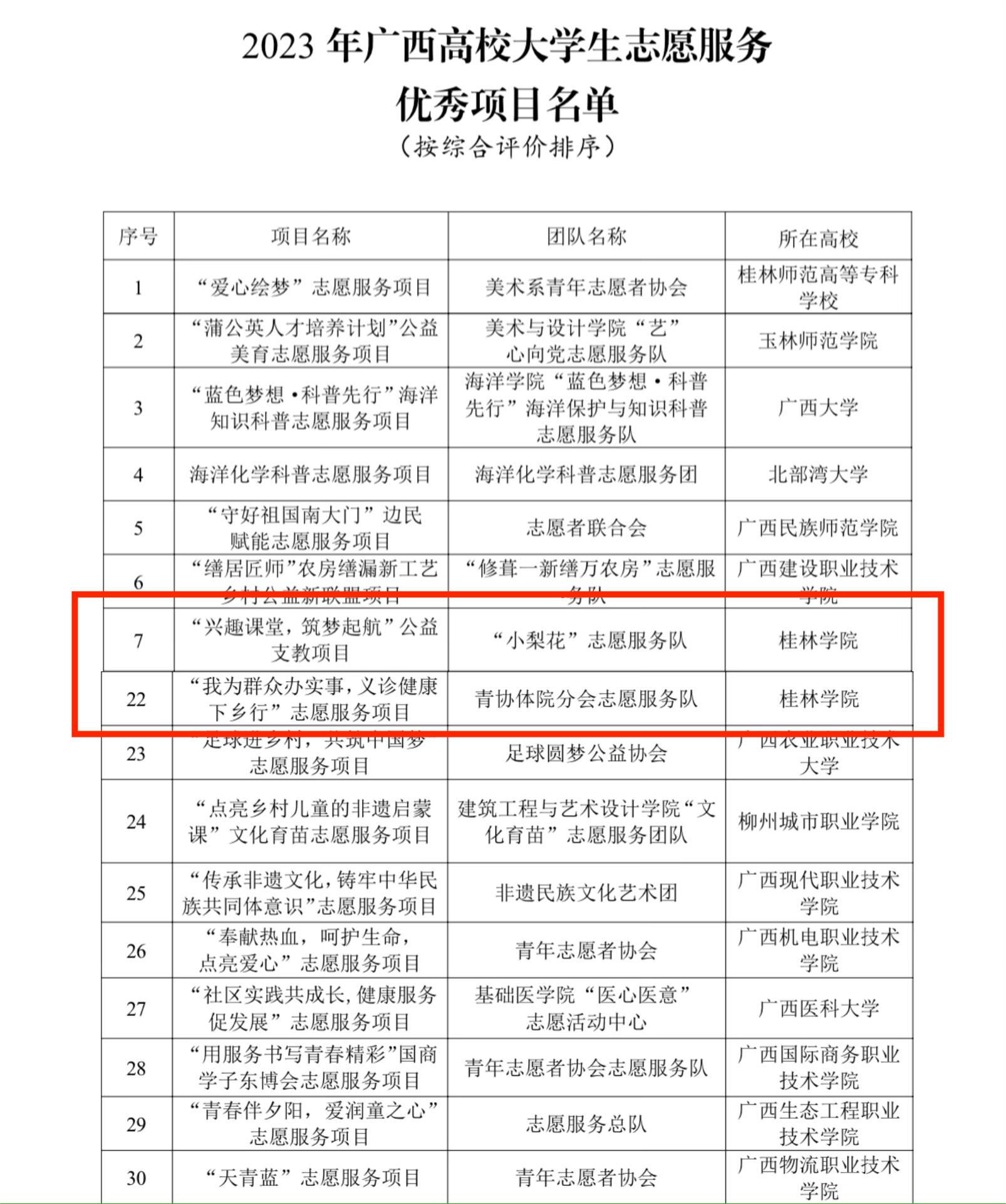 近日,为深入学习宣传贯彻习近平新时代中国特色社会主义思想和党的二十大精神,全面贯彻落实习近平总书记关于志愿服务工作的重要指示要求,持续打造广西高校大学生志愿服务品牌,自治区党委教育工委面向全区高校征集了大学生志愿服务优秀项目。经各高校自主申报、专家评审,共有30个项目入选2023年广西高校大学生志愿服务优秀项目,我校“兴趣课堂,筑梦起航”公益支教项目和“我为群众办实事,义诊健康下乡行”志愿服务项目成功入选。
