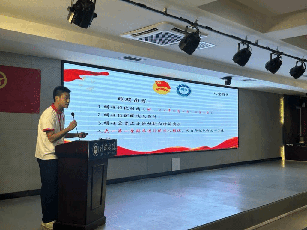 共青团学生事务中心相关负责同学针对基层团组织开展的入党推优、发展新团员以及“智慧团建”等相关内容进行了详细的讲解,明确了团组织的相关工作要求,以便各团支书更好地规范工作,提升工作效率;校青年志愿者协会相关负责同学针对“桂志愿”系统的志愿服务项目规范发布、时长记录等方面进行说明。会上,优秀团支部、团支书代表分别就自身的工作经验及工作案例进行经验分享和交流。