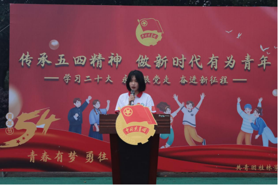 校团委书记王瑞老师在国旗下为同学们上了一堂别开生面的微团课。青马班学员代表韦馨惠同学在国旗下讲话中说到,“趁风华正茂之际,我们更应该以五四精神为不竭力量之源,树立远大人生追求与志向,筑造青春之梦。当前行的接力棒交到当代青年手中时,我们应该毅然挺起坚实的臂膀,在人民需要的时候挺身而出、迎难而上,用奉献绘就新时代青年的青春担当。”最后,升旗仪式在老师与同学举起手中的小红旗齐唱团歌中结束。