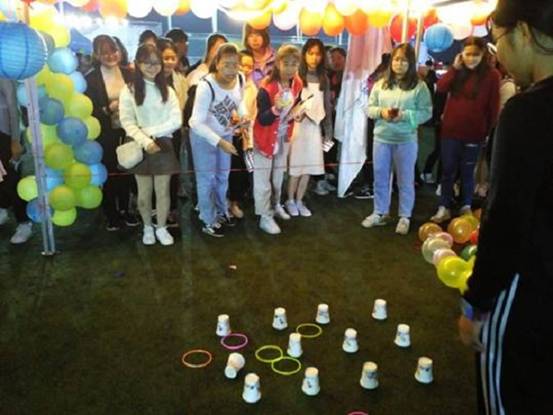 此外,英语协会还对场地用气球和彩灯等进行精心的布置,并为游园活动设置了套圈、踩气球、水上漂三个有趣的游戏,玩游戏能力高的还可以获得小礼品还有贴纸,这些游戏都需要同学们的智慧与激情,不过从现场情况上看无论是个人还是团体合作,各个学生参与活动都非常积极,游园活动一切都进行井井有条,现场工作人员协调默契,耐心的为参与活动的同学讲解游戏规则,配合同学们玩游戏,积极的带动气氛,使活动顺利而又愉快的进行,显示了英语协会组织活动的热情与活力。