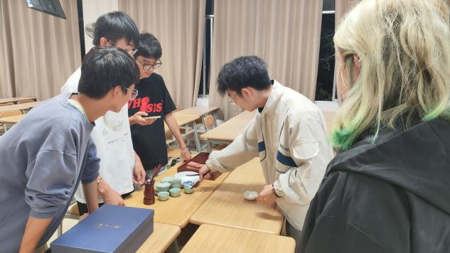 随后开始了本学期的第一次茶艺培训,培训由培训部22级成员张发铆主持。此次茶艺培训是茶艺知识培训课,培训部社员介绍了中国茶叶发展史、中国用茶的源流、饮茶方法的演变、茶叶的种类以及茶艺。讲解结束后,社团老成员带新成员认识了茶具。此次培训让23级新生对茶文化有了初步了解。随着知识的深入延伸,本次的培训接近尾声,成员对茶具也有了新的认识。