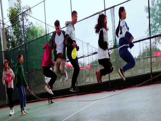 在主持人细致的讲解后,乒协成员期待已久的干训活动正式开始。首先,进行了活动热身“拍拍肩”游戏,口号是“乒协有我真棒”,增强了乒协成员的集体荣誉感。然后进行了“踩气球”、“奔跑吧,同学”“球拍”游戏,这两个游戏非常有趣。在中间休息时间有会干唱歌,为了增加素质拓展乐趣,活动中额外增加了“贴贴我”、“捕鱼”、“丢沙包”、“吹气球”、“两人三足”游戏,“贴贴我”游戏在最后倒数时间还在跑的人有惩罚,为了不受惩罚,成员们都在积极奔跑,“两人三足”游戏考验成员之间的默契,最后一个游戏是“跳绳”游戏,没想到男生也会跳绳,男生也是不容小觑的呦!活动进行到了尾声,全体成员进行了合影留念。