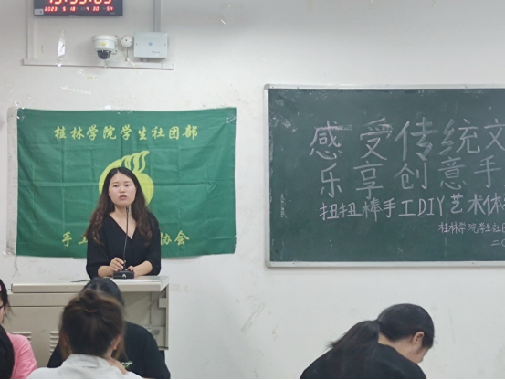 中华传统文化博大精深,任何文化的发展都需要传承,进行文化建设要取其精华去其糟粕,传统文化也是民族自信的一大来源,在传承的同时也要注入创新力量,用扭扭棒这种形式来进行手工艺术体验,手工DIY环保协会全体成员于5月18日晚上19:30在至善楼1315教室成功举办了以“感受传统文化,乐享创意手工”主题活动。此次活邀请了校团委许承婷老师、黄莉丹老师、手工DIY环保协会指导老师麻学艳老师,学生社团部社团事务部代表和明德国学社代表莅临活动现场。