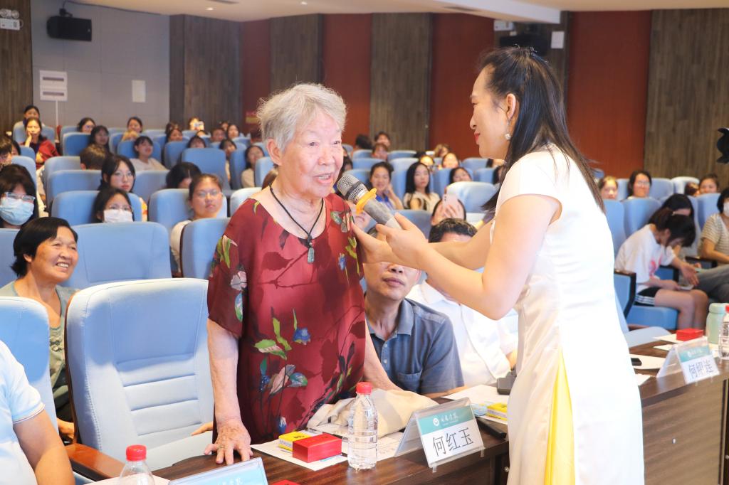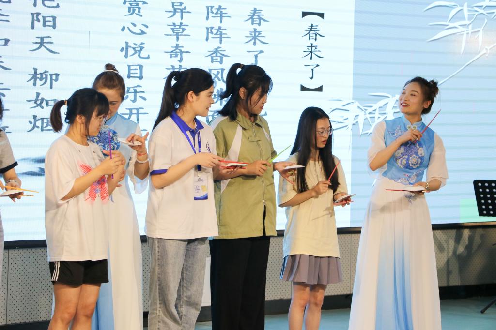随后,文艺志愿者陆絮彬开始了现场教学,陆絮彬从文场的历史渊源、艺术特色、表演方式、经典曲目和曲艺价值等方面进行了详细的介绍。陆絮彬和文场表演艺术家们一齐边讲边唱,为老师同学们带来了文场经典曲目《春来了》《桂花吟》《贵妃醉酒》等,还现场展示并教授了打碟技艺,瞬间点燃了同学们的学习热情。活动最后,何红玉、罗桂霞等老一辈艺术家也投入到教学当中。年届八十高龄的何红玉老师始终不忘自身传承人的重任,坚持到桂林大中小学进行交流,到群众性的文场社团指导排练,不遗余力地推进“广西文场”发展。她用桂林话表达了对“广西文场”的热爱,也非常开心看到“广西文场”能走进高校,这说明了国家和社会重视传承和保护非物质文化遗产。她说到自己作为“广西文场”国家级代表性传承人,有责任把文场传承下去,希望看到更多的人喜欢文场。