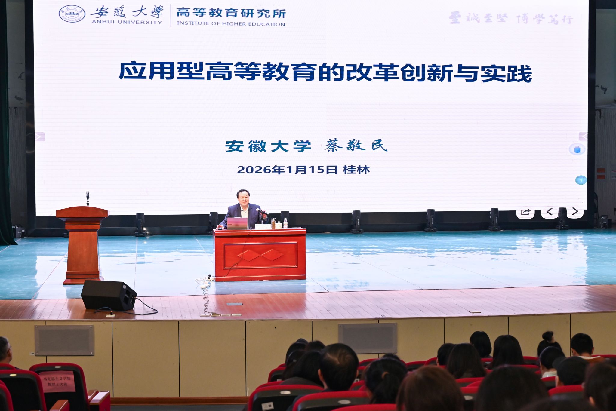 为精准把握应用型高等教育发展趋势,深化教育教学改革,助力学校迎接教育部本科教学工作合格评估,1月15日下午,学校特邀党的二十大代表、二级教授、享受国务院政府特殊津贴专家蔡敬民,作题为《应用型高等教育的改革创新与实践》的专题报告。全体在家校领导,财务总监,全体中层管理干部、教研室主任、专业负责人、教师代表及来自桂林师范学院、南宁理工学院等兄弟院校同行共同聆听报告。副校长杨庆庆主持报告会。