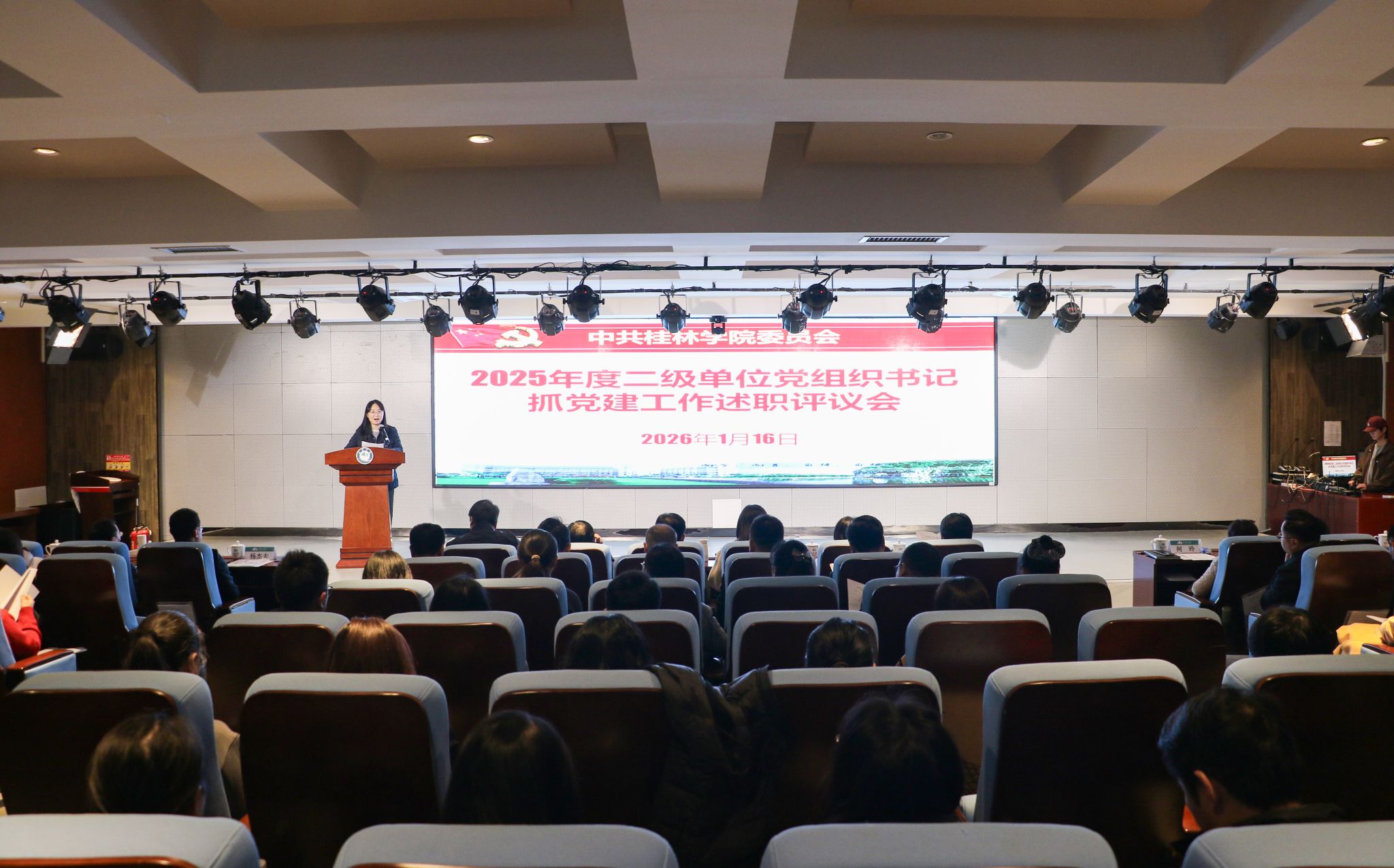 1月16日上午,学校党委在至善讲堂召开2025年度二级单位党组织书记抓党建工作述职评议会暨“党旗领航 铸魂育人”先锋行动“双融双促”优秀案例展评会,校领导唐文红、康庚莲、杨庆庆、何玲、蒋毅,监事会主席粟义春,财务总监高丽娜出席会议。桂林市委教育工委组织部莫杰列席指导,各党总支书记、副书记、组织员,全体党支部书记和党代会代表参加会议。