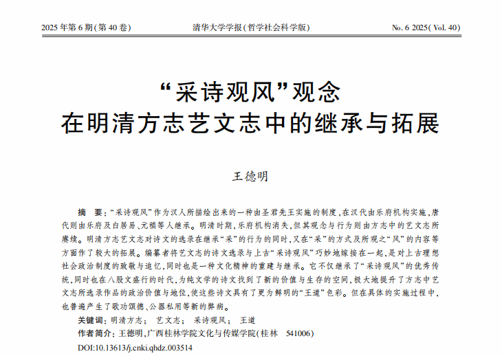 近日,在《清华大学学报》(哲学社会科学版)2025年第6期,刊发了我校王德明教授的论文《“采诗观风”观念在明清方志艺文志中的继承与拓展》,标志着我校教师在这一国内顶尖人文社科期刊发表论文实现“零的突破”。