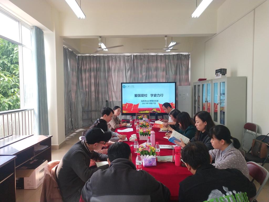 为将党史学习教育成果转化为谋划学院发展和推动思政课教学改革、思政课教师队伍成长的能力,10月28日下午,马克思主义学院党支部组织全体教师开展了“爱国爱校、学史力行”主题党日活动,活动由党支部书记吴秋燕主持。