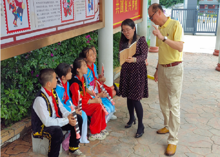 在校园一角,彭超教授和广西师大林冬老师辅导小学生演奏口风琴,张宗贺老师在教一批小朋友演奏竖笛,不大的功夫,孩子们就能够演奏出简单的歌曲。
