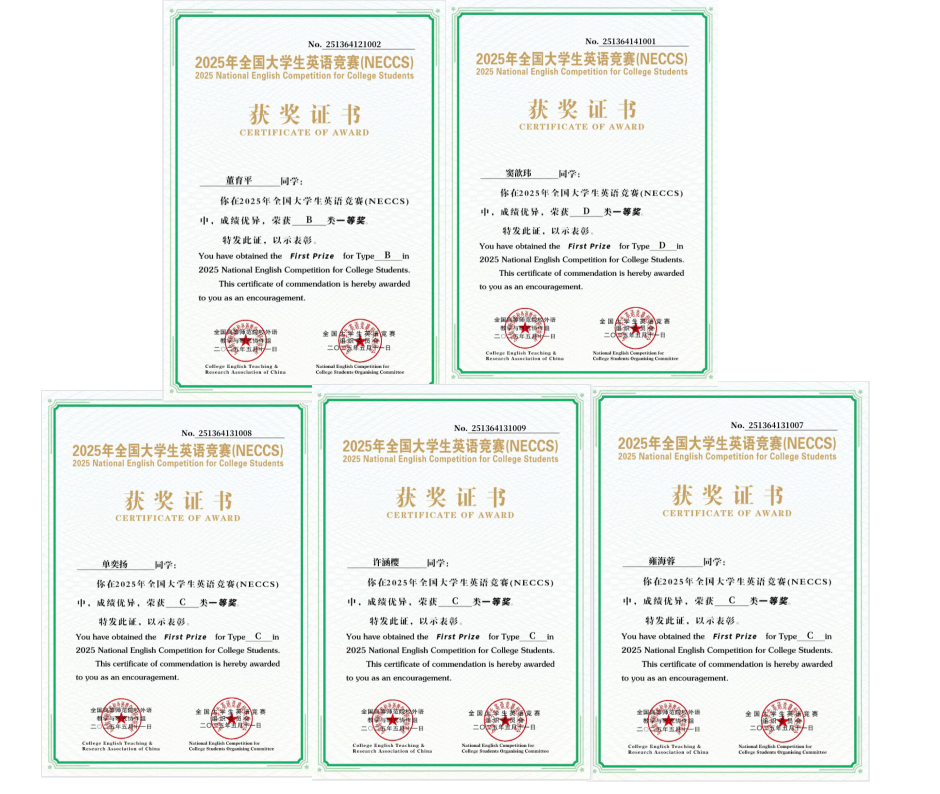 近日,2025年全国大学生英语竞赛结果发布,我校2022级英语专业学生董育平获大赛广西赛区B类一等奖,2022级数字出版专业学生雍海蓉、2024级健康服务与管理专业学生单奕扬、2024级智能测控工程专业学生许涵樱获大赛广西赛区C类一等奖,2024级播音与主持艺术专业学生窦歆玮获大赛广西赛区D类一等奖。