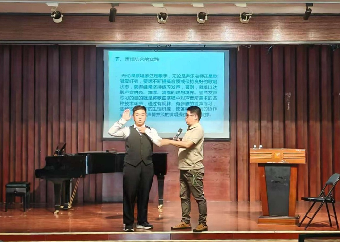 讲座中,针对师生广泛关注的科学发声等热点问题,刘建刚副教授不仅进行了精辟的理论阐释,还现场邀请声乐专业学生进行示范演唱,并依据每位学生的音色特点及作品要求,量身定制训练方案。在互动过程中,刘教授精准点拨,引导学生即时调整发声位置、气息支撑与情感投射,在细微的声音调整间,有效优化了音质,显著提升了音乐表现力,实现了教学相长的示范效果。